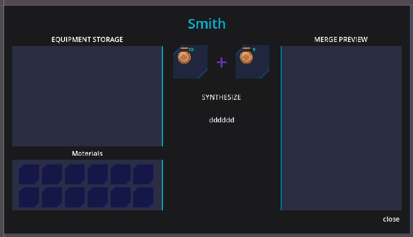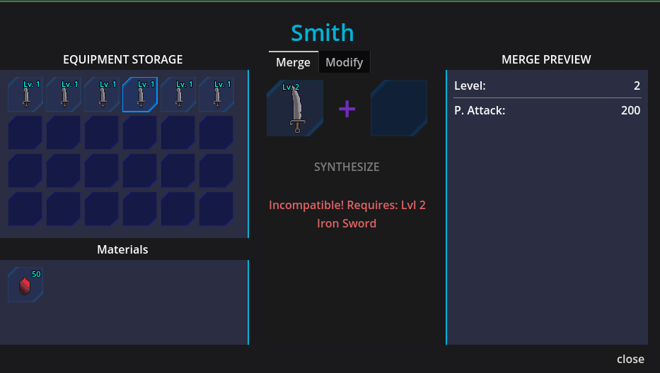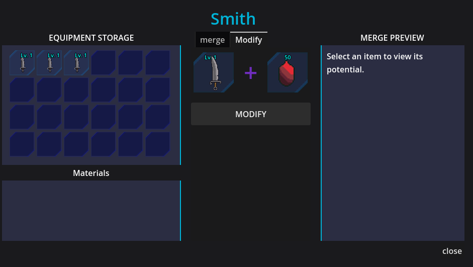 Drop your equipable in Slot 1 → it locks in place Drop a material stack in Slot 2 → spam “Modify” like you’re speedrunning loot Every click eats exactly one material and applies the modifier UI stays open so you can keep going until the stack is gone or your sword is stupid strong